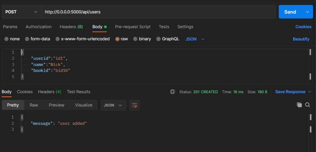 Like before, we start by reading the csv file. Then we use the request object to extract and parse the data provided in the request as JSON. We can then index the data variable to get the userid, name and bookid provided through Postman. We store these values in a list which we call user.