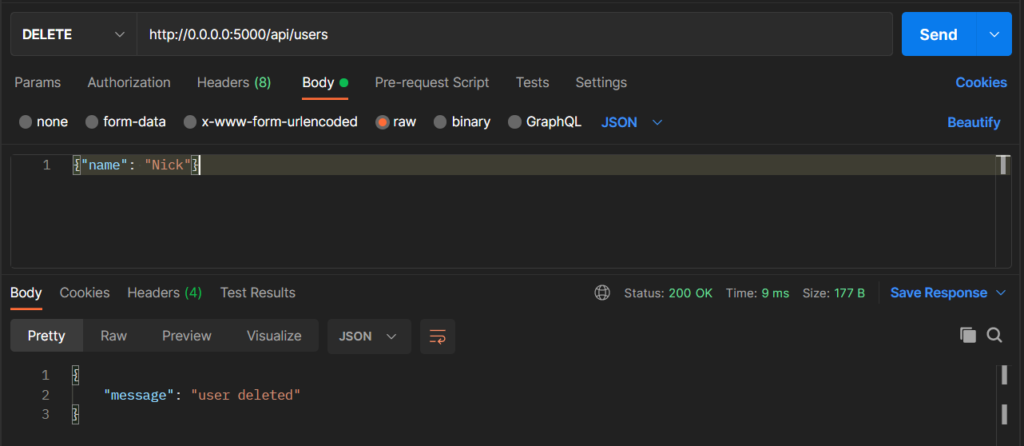 We need to remember to specify the name of the user we wish to delete as a JSON object in the body tab. Also we double-check the request type is DELETE.