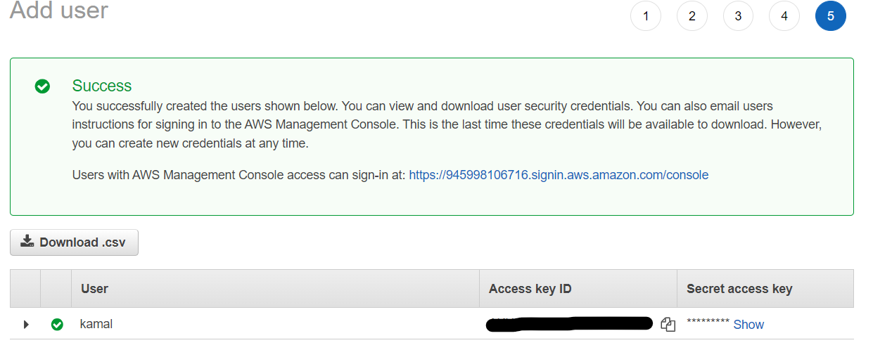 - Click 'Create User' and you will be shown the 'Access key ID' and 'Secret access key'