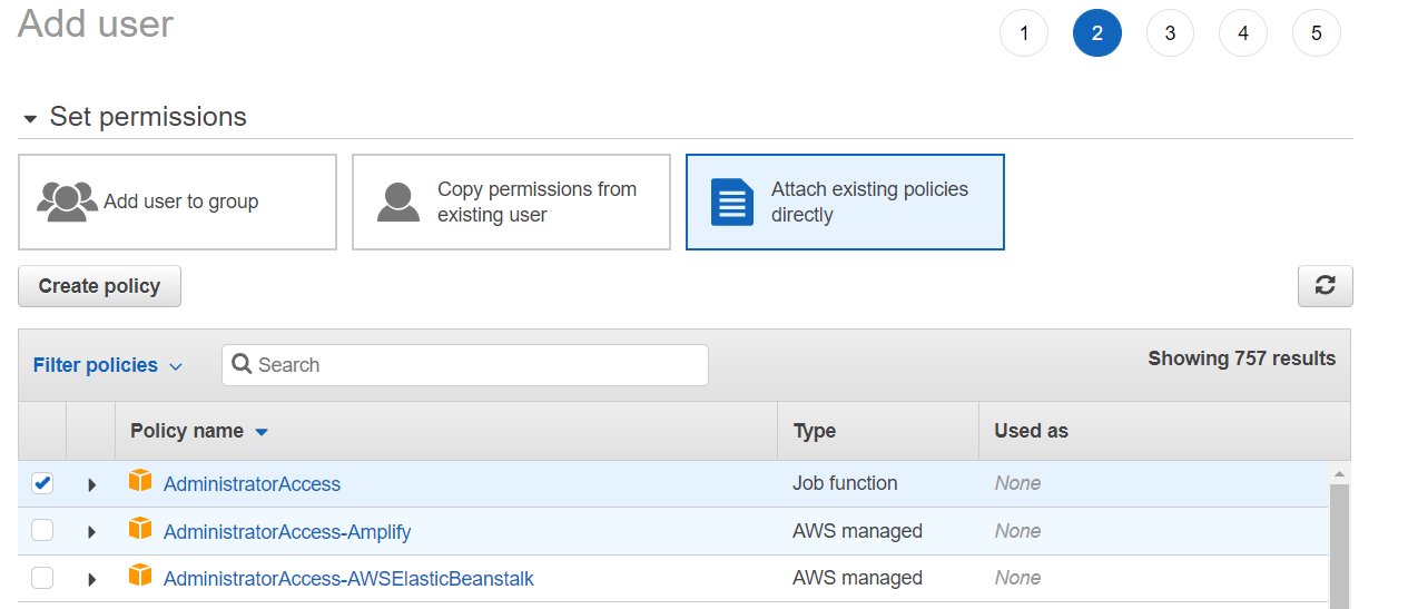 - Click 'Attach existing policies directly' and choose AdministratorAccess