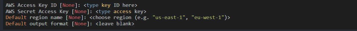aws configureThen copy and paste in the access key ID and Secret access key from before. Just press enter for the 'default region name' and the 'output format'.