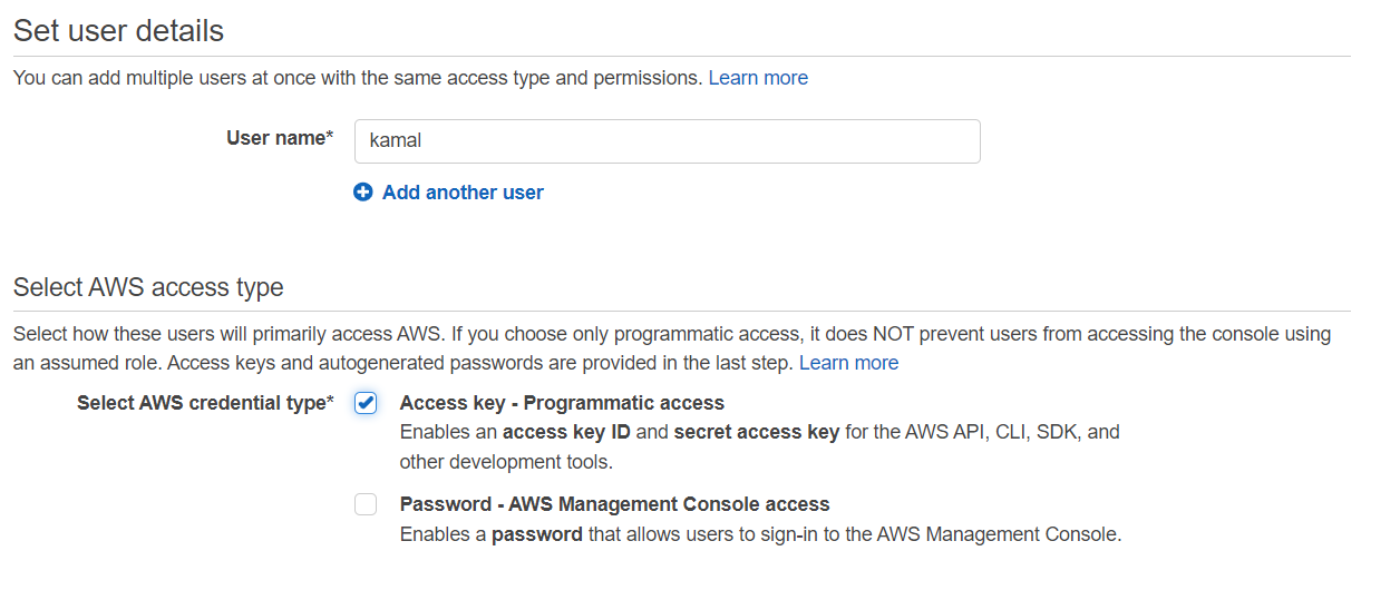 - Type a name for the user and enable Access Key - Programmatic access in the checkbox