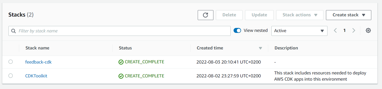 When CDKToolkitis done deploying, we can finally deploy the feedback-cdk stack with: