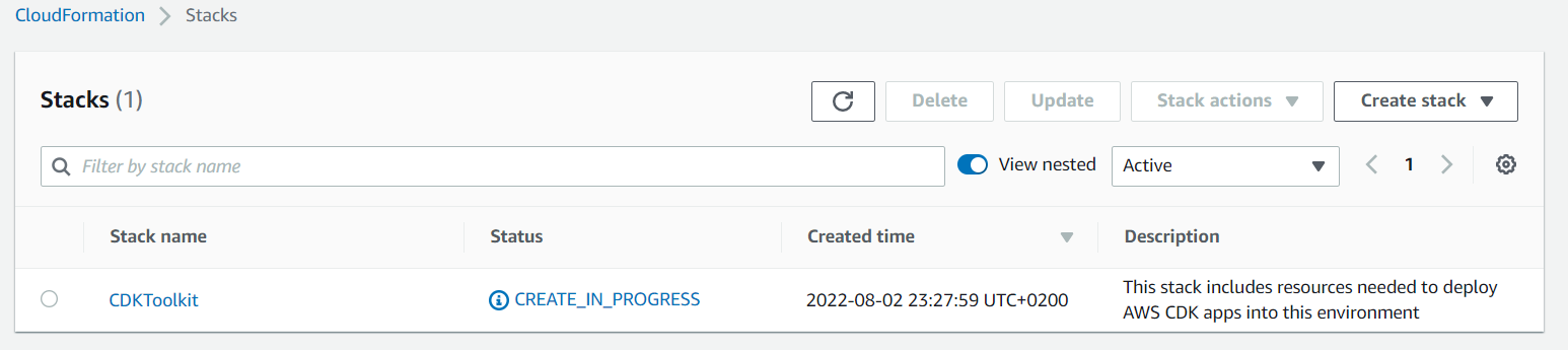 If you search for 'CloudFormation' in the AWS console you should now see a CDKToolkit stack being deployed: