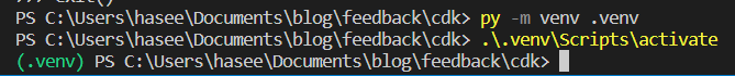 |__cdkCheck to see if a .venv folder is created at feedback/cdk/.venv. You can also check the terminal window which will say if automatic python venv creation failed or not.