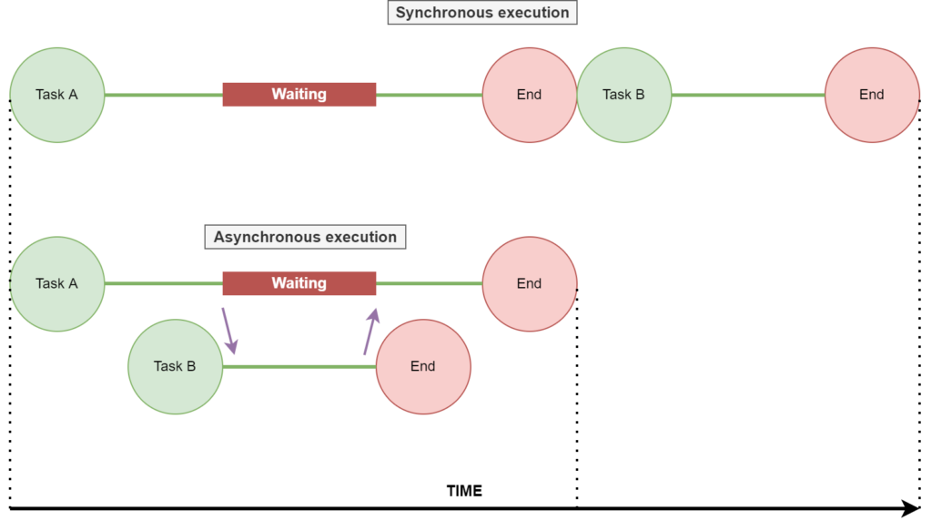 As you can see, in synchronous execution (WSGI) a single thread can only handle one request at a time. So, if the current request has some blocking code where it needs to wait for some results a lot of time is wasted (as can be seen in the waiting block in the diagram above). Only once the entire of task A is finished, can the thread move to task B.