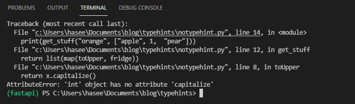 Even though we declared x to be of type str the get_stuff() function happily accepts a List with one int element and toUpper() attempts to call capitalize() on the int object.