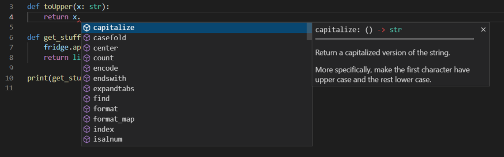 Since we define fridge to be a list of strings VS Code (with PyLance and Python extensions) provides instant code completion. If you type fridge. notice how the suggestions pop up: